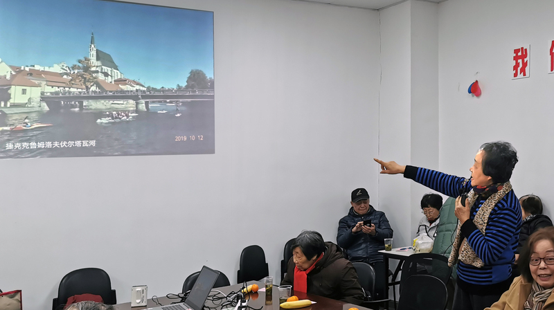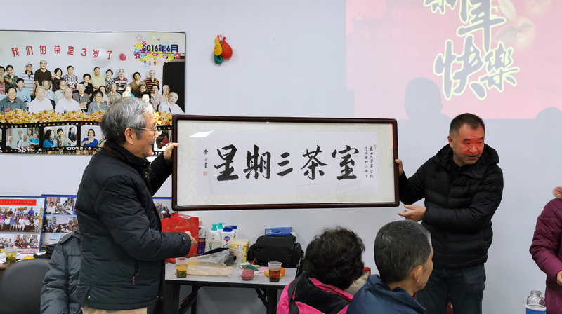 此次展出的书法作品包括篆书、隶书、楷书、行书等不同书体,笔法苍劲有力,气韵生动。其中,潘家祜老师的一整版小楷是花了三个多小时才完成的。油画、国画作品涉及静物、山水、花鸟,用笔娴熟,栩栩如生,每幅作品都尽显书画魅力。摄影作品有重走长征路系列照片,有祖国的大好河山和花草虫鸟,也有欧陆国家美丽的古典建筑、南半球的风景名胜,全部是老师们近两年旅游时候所拍摄。九十高龄的龚佳玲老师虽未到现场,但委托朱建华老师代为讲解,并将一幅山水画作赠送给茶室;费正老师向茶室赠送了他亲笔书写的“星期三茶室”匾额和春联。欣赏着一篇篇优美作品,听着老师们对自己参展作品的讲解,一个半小时很快就过去了。陈纪岳老师抓拍了许多精彩瞬间,何钗光老师录制了多个短视频,发在退休教师微信群,分享给没有到场的老师们。