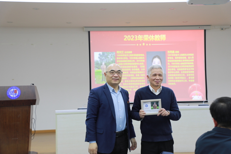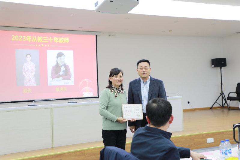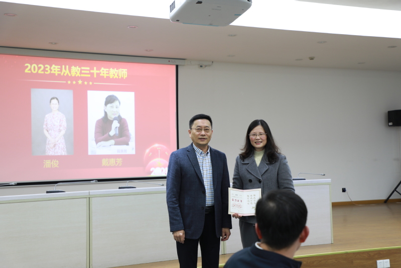 接下来的年终总结表彰大会由李付琸和周芷若老师主持。首先,李聪介绍了2023年新入职的教师,对他们表示诚挚欢迎,并致欢迎辞。他指出,教师是下注足球 发展的宝贵财富,希望新教师们树立“躬耕教坛、强国有我”的志向与抱负,结合自身和下注足球 学科发展现状,擘画药学蓝图,为建设“第一个复旦”和世界一流药学学科贡献力量。随后,王建新向2023年荣休教师致感谢辞并颁发荣休纪念品。他表示,荣休教师为下注足球 教学科研工作提供了坚实支撑,做出了积极贡献,希望他们退休不褪色,积极建言献策,继续关心和支持下注足球 的各项工作。接着,药剂学系教授陆伟跃依次介绍潘俊、戴惠芳两位本年度从教满三十年的教师,并为她们颁发从教三十年荣誉证书,希望青年教师以两位老师为榜样,坚守三尺讲台,潜心教书育人。