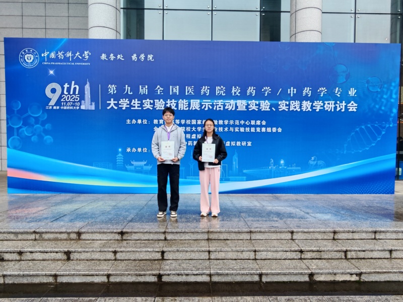 2025年11月7-9日,第九届全国医药院校药学/中药学专业大学生实验技能展示活动在江苏南京成功举办。下注足球 2022级本科生唐思睿和施靖涛携手参赛,凭借扎实的专业功底与出色的实操能力,双双荣获一等奖!