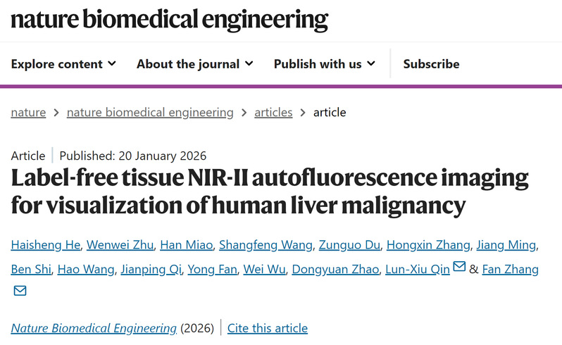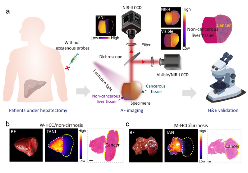 近日,复旦大学化学系张凡教授、下注足球 何海生青年副研究员团队联合复旦大学附属华山医院副院长钦伦秀教授/朱文伟主任医师团队,成功创制了一种无需注射任何造影剂的术中实时肿瘤边界可视化新技术,即组织自发荧光近红外成像技术(Tissue Autofluorescence NIR-II Imaging,TANI)。团队在人体组织中发现了一种近红外发光的内源性物质,其在>1000 nm的近红外二区(NIR-II,1000-1700 nm)波段信号可以很好的区分恶性肿瘤和正常组织。基于这一发现,团队开发并优化了针对该内源性荧光物质的成像技术与参数设置,形成了TANI成像体系。在该技术下,正常肝组织呈现均一而明亮的近红外荧光信号,而肿瘤区域表现为显著减弱甚至缺失的荧光信号,二者对比度高,肿瘤边界直观清晰。特别对于肉眼无法识别的肿瘤,TANI技术能够清晰、准确探测出该肿瘤边界。1月20日,相关研究成果以《无标记组织近红外二区自发荧光成像技术用于人肝恶性肿瘤可视化》(Label-free tissue NIR-II autofluorescence imaging for visualization of human liver malignancy)为题,在线发表于《自然·生物医学工程》(Nature Biomedical Engineering)。