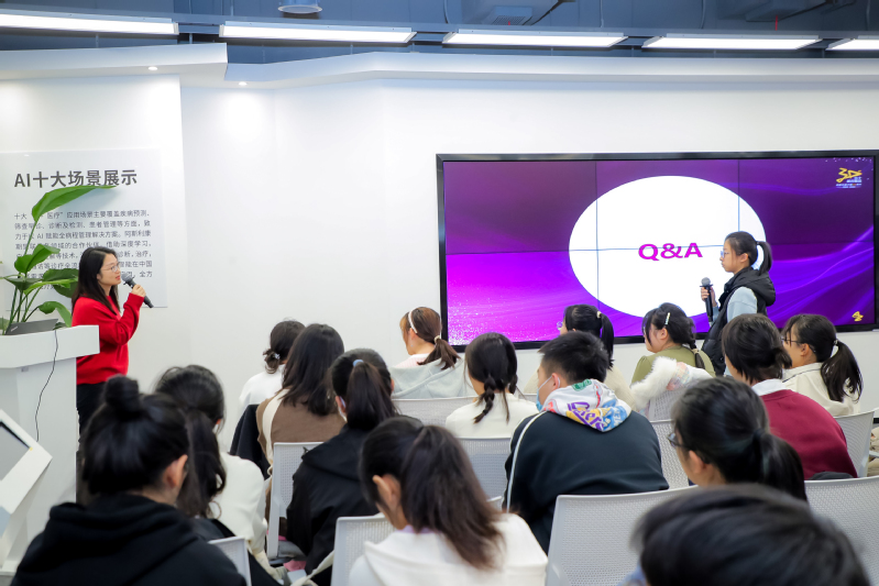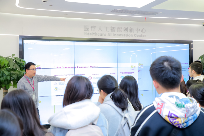 接着,同学们前往医疗人工智能创新中心。企业人员为同学们讲解了阿斯利康在医药研发、医药投资等方面的创新举措,并引领大家参观了健康管理支持中心模型的概念模型,介绍了通过人工智能系统直接整合所有实验数据来避免数据失真,通过规范化测量技术实现高效自助测量的方法,最后总结其现阶段良好的工作成效,令同学们更细节地感受到企业的创新文化。