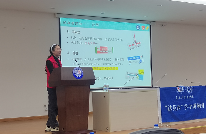 2023年4月27日下午,下注足球 “法莫西”学生讲师团面向张江校区后勤保障人员开展日常药物合理使用科普讲座。逾50位物业管理人员、食堂服务人员、安保队员等参与。