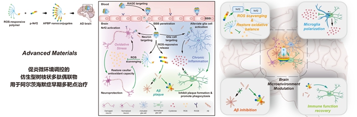 Recently, Professor Chen Jiang from School of Pharmacy, Fudan University, has developed a biomimetic dendrimer-peptide nanoconjugate, which had the function of regulating the pro-inflammatory microenvironment of brain lesions and was used for early multi-target treatment of Alzheimer’s disease (AD). The relevant studies were published online in Advanced Materials (IF=27.394), named entitled “Biomimetic Dendrimer-Peptide Conjugates for Early Multi-Target Therapy of Alzheimer’s Disease by Inflammatory Microenvironment Modulation”.